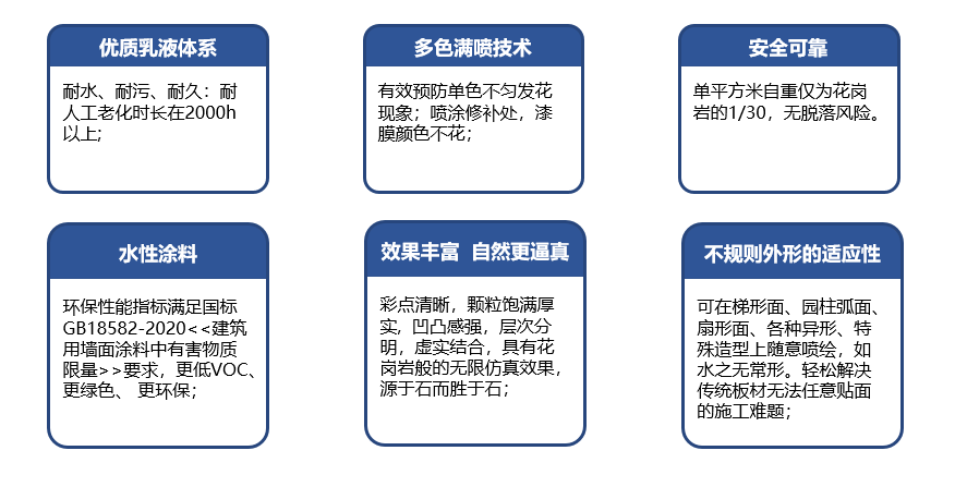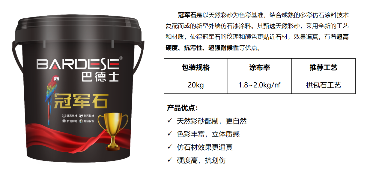 冠军石是以天然彩砂为色彩基准,结合成熟的多彩仿石涂料技术复配而成的新型外墙仿石漆涂料。其甄选天然彩砂,采用全新的工艺和材质,使得冠军石的纹理和颜色更贴近石材,效果逼真,有着超高硬度、抗污性、超强耐候性等优点。