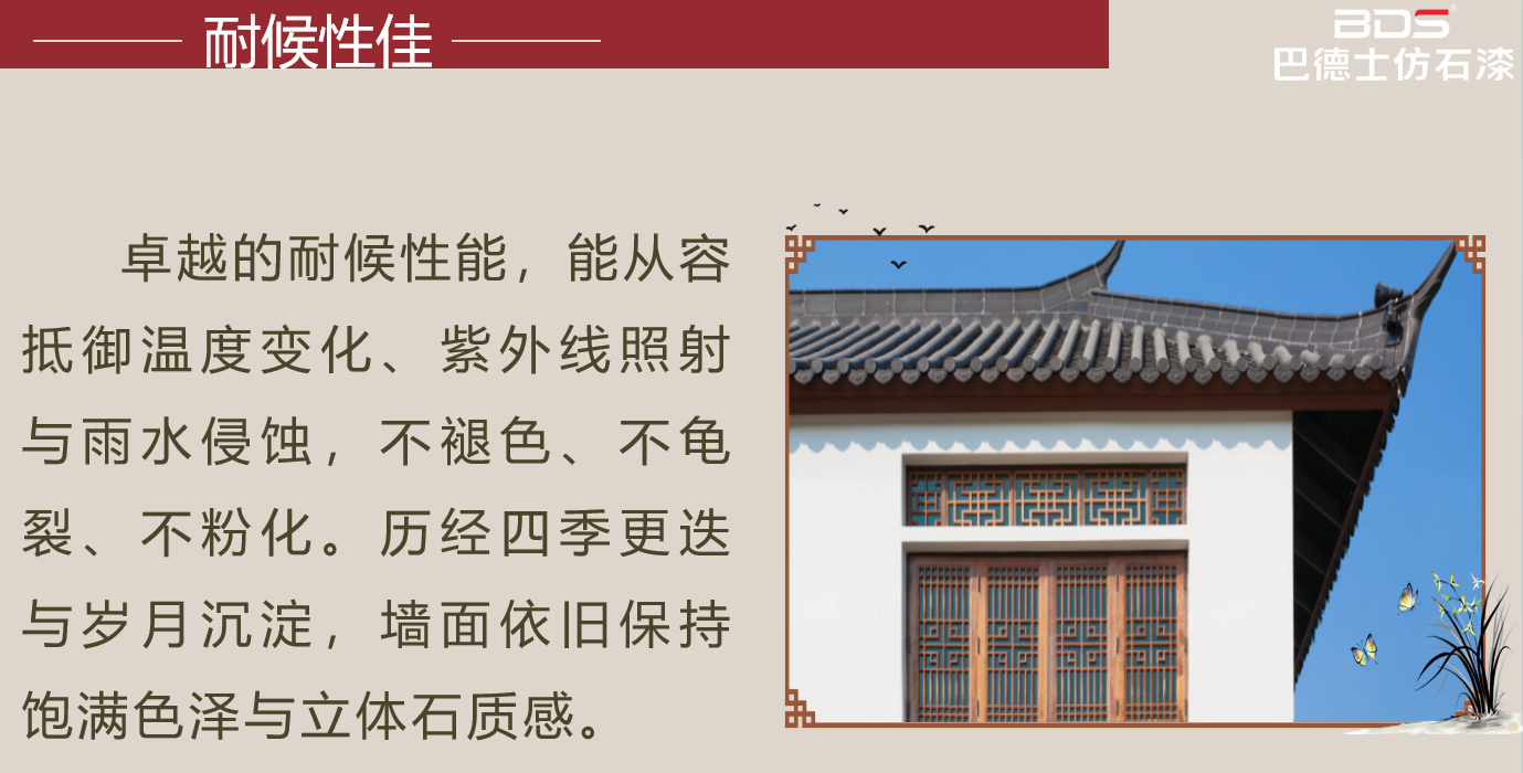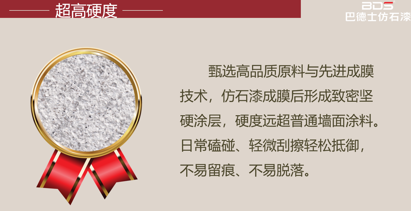 如意石采用特种高性能聚合物乳液为优质原材料,结合独创融合胶体技术,提升彩点的质感和清晰度,使仿荔枝面石材效果更逼真自然,不是天然宛若天然。同时产品具有超高硬度、耐水性好、耐候性佳等性能特点,是别墅、民俗、酒店等建筑外立面装饰优选产品。