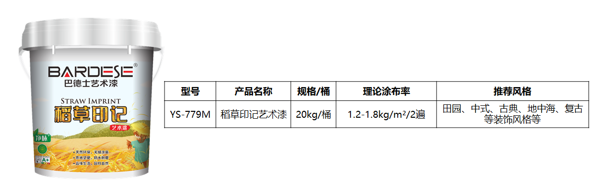 巴德士稻草印记艺术漆是一款采用纳米碳酸钙、优质田间稻杆、石英砂等原材料精制而成的生态产品。该产品具有柔韧度