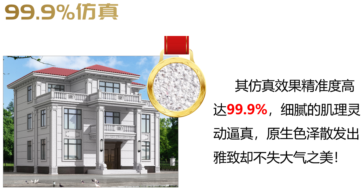 铂金石是一款采用高性能聚合物乳液及天然彩砂等优质原材料精制而成的产品,具有强荔枝面花岗岩纹理效果,宛如天然石材的质感给别墅外墙带来高贵典雅的装饰美感,同时产品性能优异、耐水耐污耐候,能保护建筑外墙历久弥新。