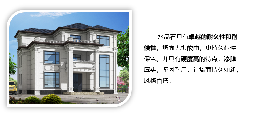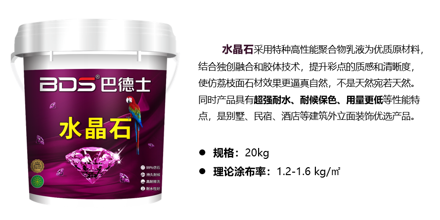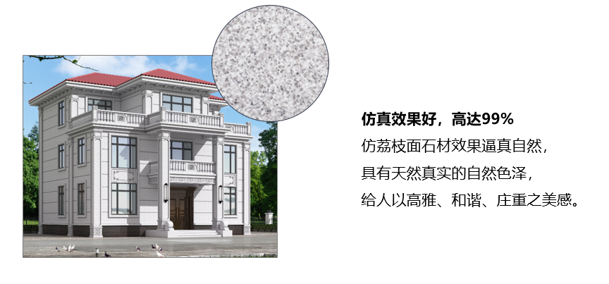 水晶石采用特种高性能聚合物乳液为优质原材料,结合独创融合和胶体技术,提升彩点的质感和清晰度,使仿荔枝面石材效果更逼真自然,不是天然宛若天然。同时产品具有超强耐水、耐候保色、用量更低等性能特点,是别墅、民宿、酒店等建筑外立面装饰优选产品。