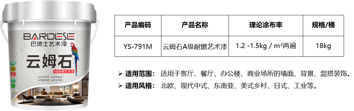 施工材料:艺术漆渗透加固底漆、厚浆型专用含砂底漆、云姆石A级耐燃艺术漆、净味防尘面漆