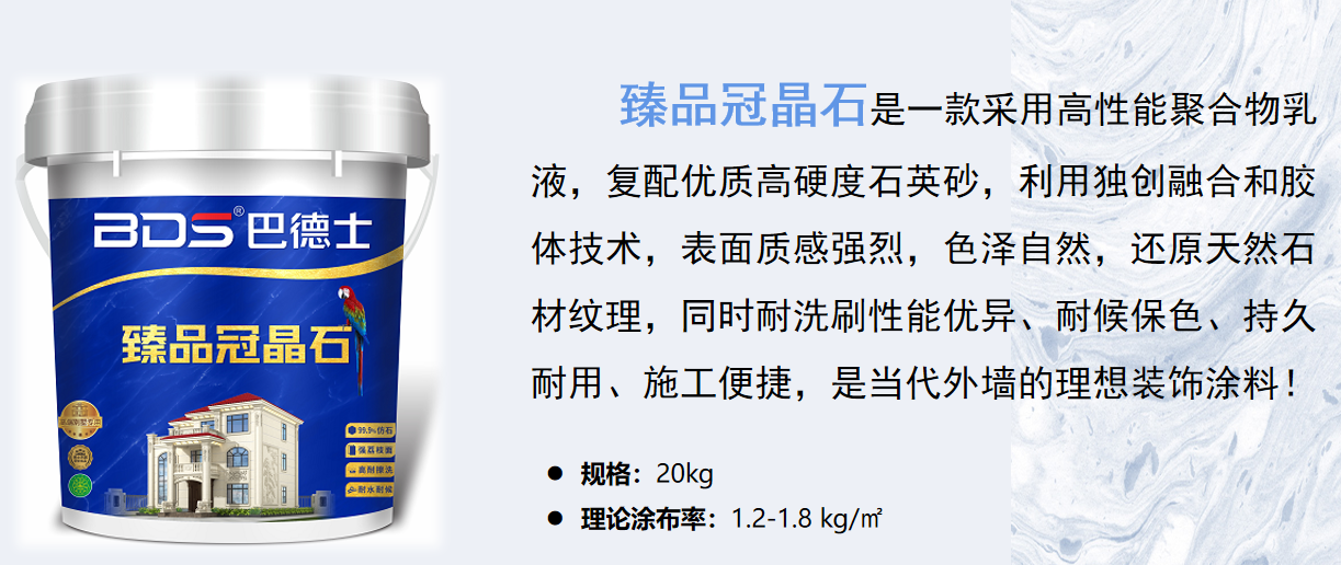 臻品冠晶石是一款采用高性能聚合物乳液,复配优质高硬度石英砂,利用独创融合和胶体技术,表面质感强烈,色泽自然,还原天然石材纹理,同时耐洗刷性能优异、耐候保色、持久耐用、施工便捷,是当代外墙的理想装饰涂料!